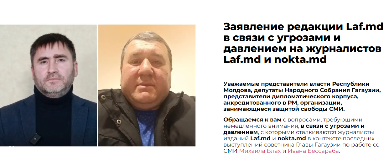 В связи с угрозами и давлением, с которыми сталкиваются журналисты изданий Laf.md и nokta.md в контексте последних выступлений советника Главы Гагаузии по работе со СМИ Михаила Влах и Ивана Бессараба, редакции призывают соответствующие органы власти в Гагаузии и Республике Молдова принять срочные меры для обеспечения безопасности журналистов и тщательного расследования инцидентов давления на них.
