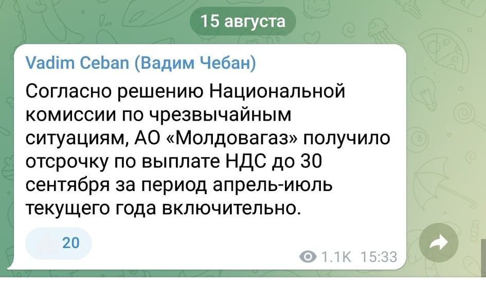 «Согласно решению Национальной комиссии по чрезвычайным ситуациям, АО «Молдовагаз» получило отсрочку по выплате НДС до 30 сентября за период апрель-июль текущего года включительно», написал Чебан.