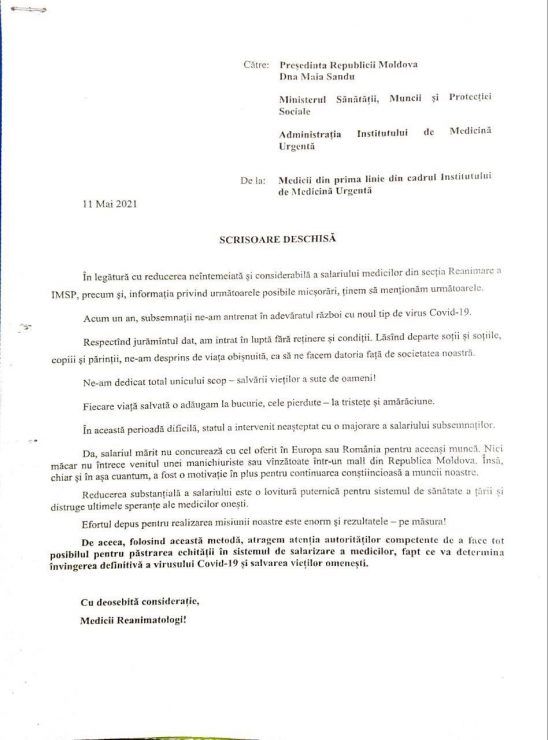 «…Мы полностью посвятили себя единственной цели — спасению жизни сотен людей!.. Значительное снижение заработной платы является сильным ударом по системе здравоохранения страны и разрушает последние надежды честных врачей. Усилия, приложенные для достижения нашей миссии, огромны, и результаты — соответственно! Поэтому, мы обращаем внимание компетентных органов на то, чтобы сделать все возможное для сохранения справедливости в системе оплаты труда врачей, что приведет к окончательной победе над вирусом Covid-19 и спасению человеческих жизней», — написали врачи.