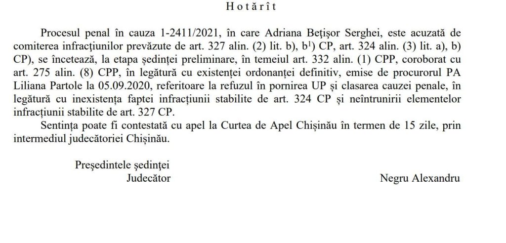 Следует отметить, что бывшего гособвинителя обвиняли в «пассивной коррупции», «злоупотреблении служебным положением», а также «вмешательстве в отправление правосудия и уголовное преследование». В частности, Бецишор обвинили в том, что в 2018 году, когда она работала прокурором, она якобы требовала от осужденного 50 тысяч евро, чтобы переквалифицировать его действия и снять обвинения по делу, находящемуся на рассмотрении Апелляционной палаты Кишинева.