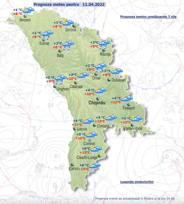 Согласно прогнозу синоптиков, в понедельник, 11 апреля, в Молдове будет холодный и пасмурный день. Пройдут дожди, в северных и центральных районах ожидается дождь со снегом. Ветер северо-западный, умеренный до сильного.