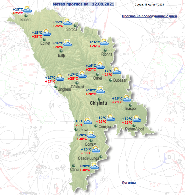 Согласно прогнозу синоптиков, 12 августа в Молдове ожидается переменная облачность, без осадков. Ветер северо-западный будет дуть со скоростью 3 — 8 м/с. Погода определяется областью повышенного атмосферного давления.