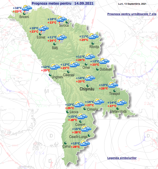 Согласно прогнозу синоптиков, 14 сентября в Молдове ожидается переменная облачность, на севере страны пройдут кратковременные дожди с грозами. Ветер северо-западный, слабый до умеренного.