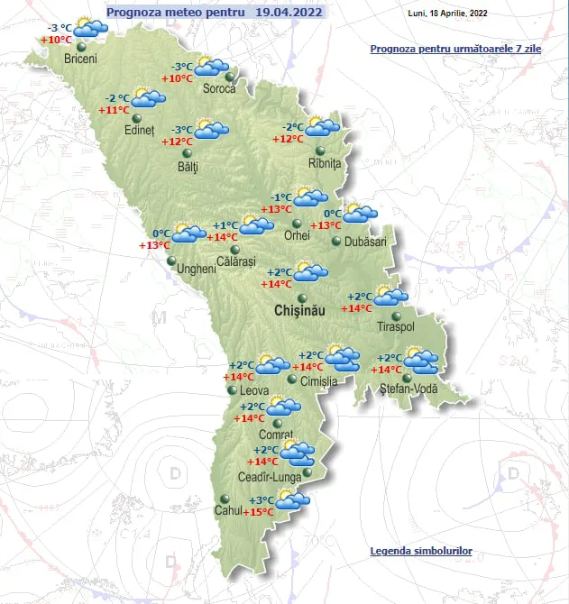 Согласно прогнозу синоптиков, во вторник, 19 апреля, на территории Молдовы сохранится прохладная погода: переменная облачность, без осадков. В северных районах возможны заморозки. Ветер северо-западный, умеренный до сильного.