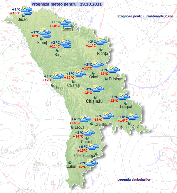 Согласно прогнозу синоптиков, 19 октября в Молдове ожидается переменная облачность. Ветер северо-западный, слабый до умеренного.