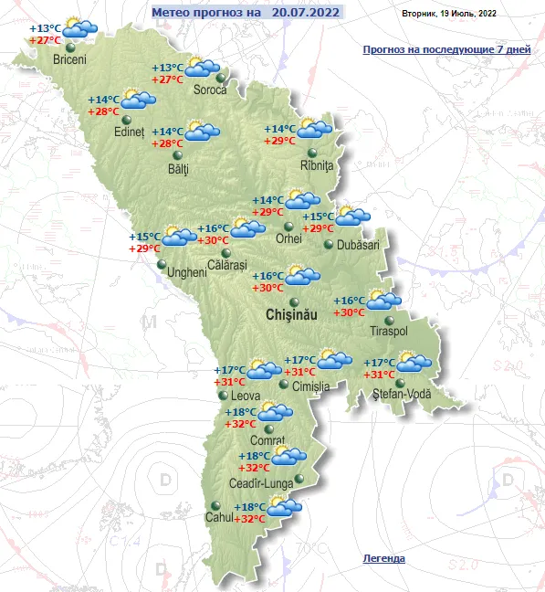 Согласно прогнозу синоптиков, 20 июля на всей территории Молдовы ожидается малооблачная погода, без осадков. Ветер северо-западный, умеренный до сильного — порывами до 10 м/с.