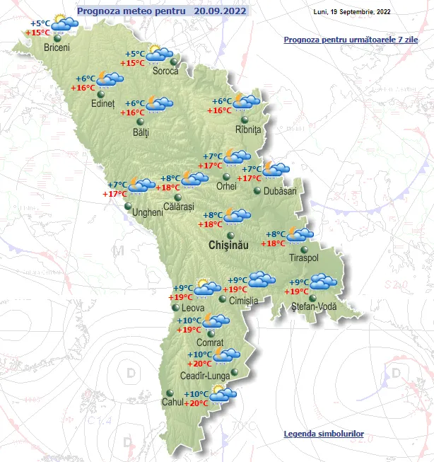 Согласно прогнозу синоптиков, 20 сентября на территории Молдовы ожидается облачная погода. Во всех районах страны местами могут пройти небольшие дожди. Ветер северо-западный, умеренный до сильного.