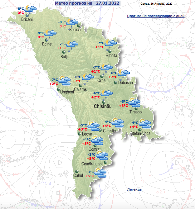 Согласно прогнозу синоптиков, 27 января в центре и на севере Молдовы выпадут слабые осадки в виде снега. Ветер восточный, слабый до умеренного.