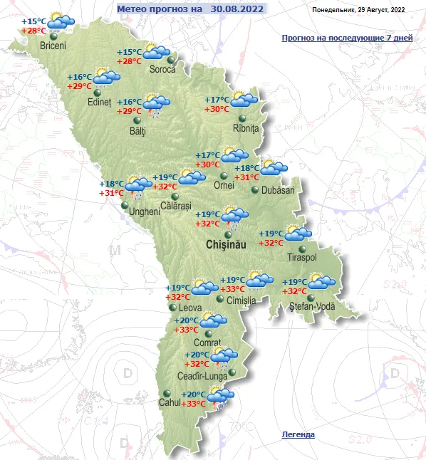 Согласно прогнозу синоптиков, 30 августа на территории Молдовы ожидается переменная облачность. Осадки преимущественно возможны в южных и северных районах, а также в столице. Ветер северо-западный, умеренный до сильного.
