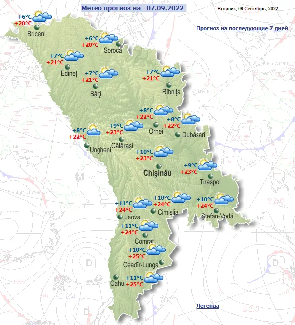 Согласно прогнозу синоптиков, 7 сентября на территории Молдовы погода определяется областью повышенного атмосферного давления: малооблачно, без осадков. Ветер юго-восточный, умеренный.